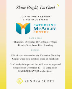 Shop Kendra Scott in the Iowa River Landing on December 18th, and 20% of your sale will be donated to the Catherine McAuley Center when you mention us at checkout!